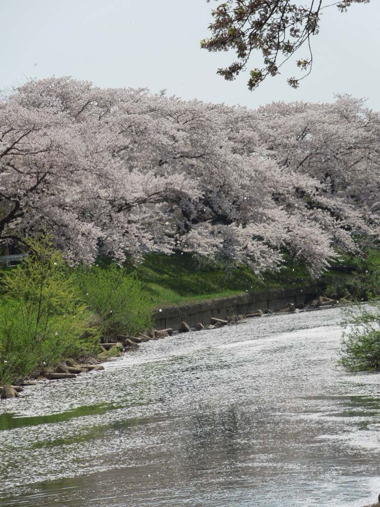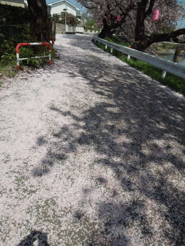川の白っぽいところは花びらです。